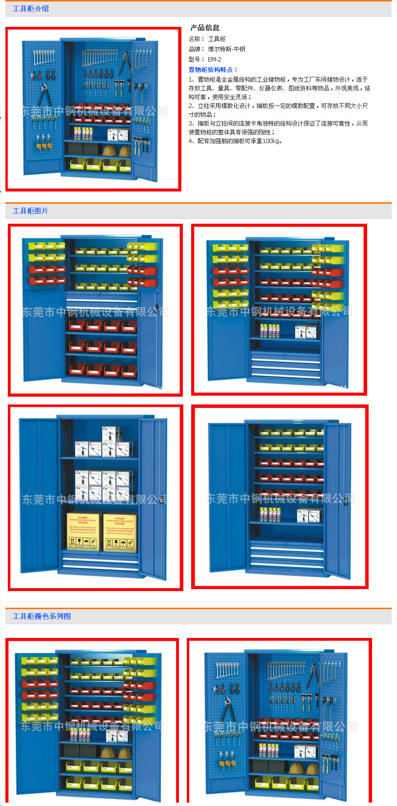 3、 柜门及柜内均可设置挂板,配备零件盒及各型挂钩,充分利用空间。